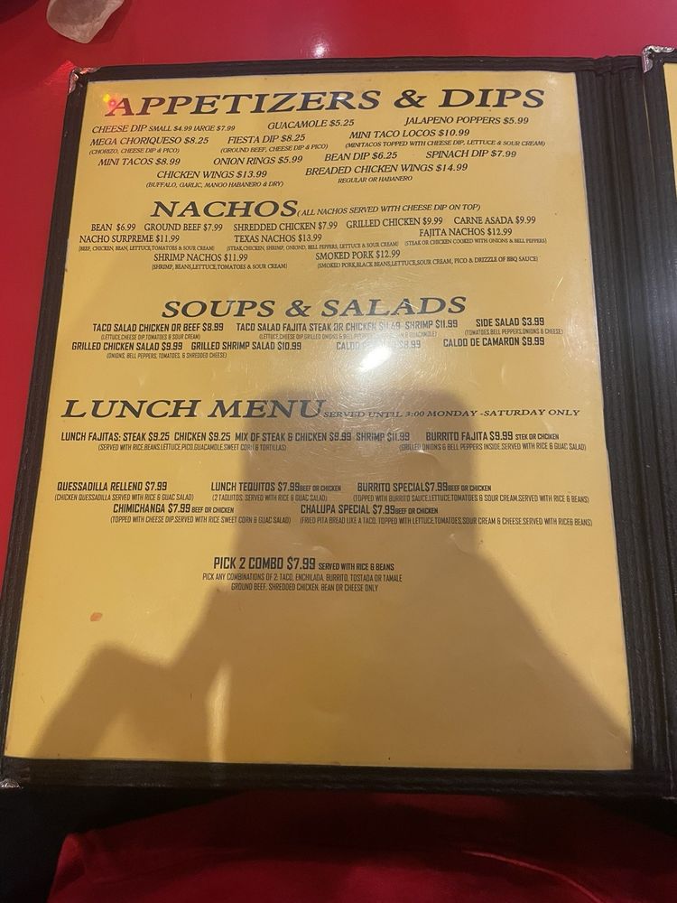 Steak, chicken, shrimp, scallopes, imitation crab, bacon, onions, & jalapenos. Topped with cheese dip. Served with rice & beans